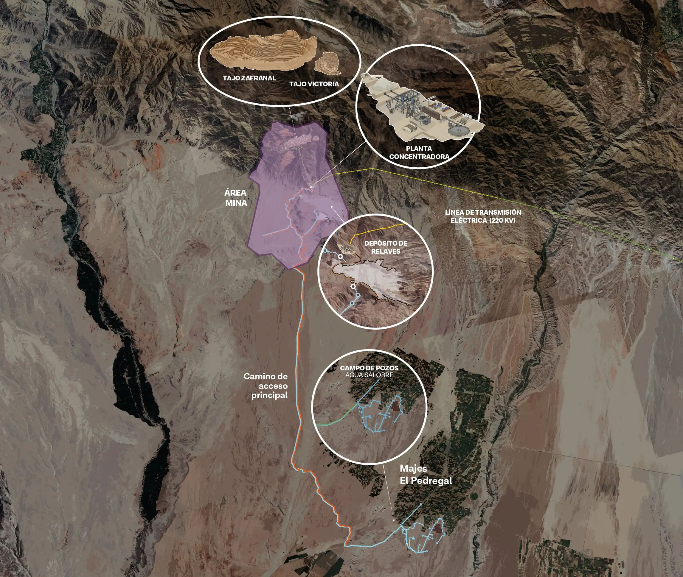 El proyecto considera tres componentes principales: el Área Mina, el Área de la Línea de Transmisión Eléctrica y el Área de Acceso y Abastecimiento de Agua.